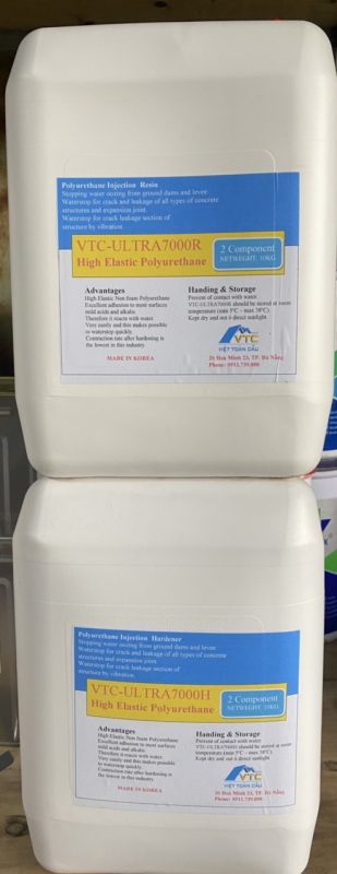 ĐẶC ĐIỂM ULTRA -7000 có đặc tính đàn hồi cao do đó không bị đứt gãy khi bị nén. ULTRA -7000 là loại vật liệu polyurethane 2 thành phần tự phản ứng với nước, nó có độ kết dính cao và độ co dãn cao trên vết nứt trên bề mặt khô và ướt. Độ nhớt thấp sẽ cho phép thâm nhập vào điểm rò rỉ và ngăn chặn nước một cách tuyệt vời và cũng rất dễ dàng để bơm phun. Khi trộn hai thành phần với nhau, bạn có đủ thời gian làm việc (khoảng 60 ~ 100 phút), do đó bạn có thể bơm phun bằng cách sử dụng máy bơm keo loại 1 thành phần. Và bạn có thể kiểm soát thời gian đông cứng một cách tự do bằng cách thêm chất xúc tác.